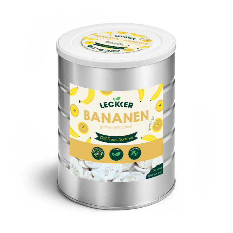In diesen Snack-Dosen stecken knackige Scheiben von vollreifen Bananen, aber nicht irgendwelche. Unsere gefriergetrocknete Banane überrascht mit natürlicher Süsse, einer cremig-knusprigen Konsistenz und einem Aroma, das absolut einzigartig ist. Ganz ohne Zuckerzusatz, ganz ohne Zusatzstoffe, einfach pure Frucht. Dazu passen die Dosen perfekt in jede Tasche und bietet den idealen Snack, ganz egal wann & wo.