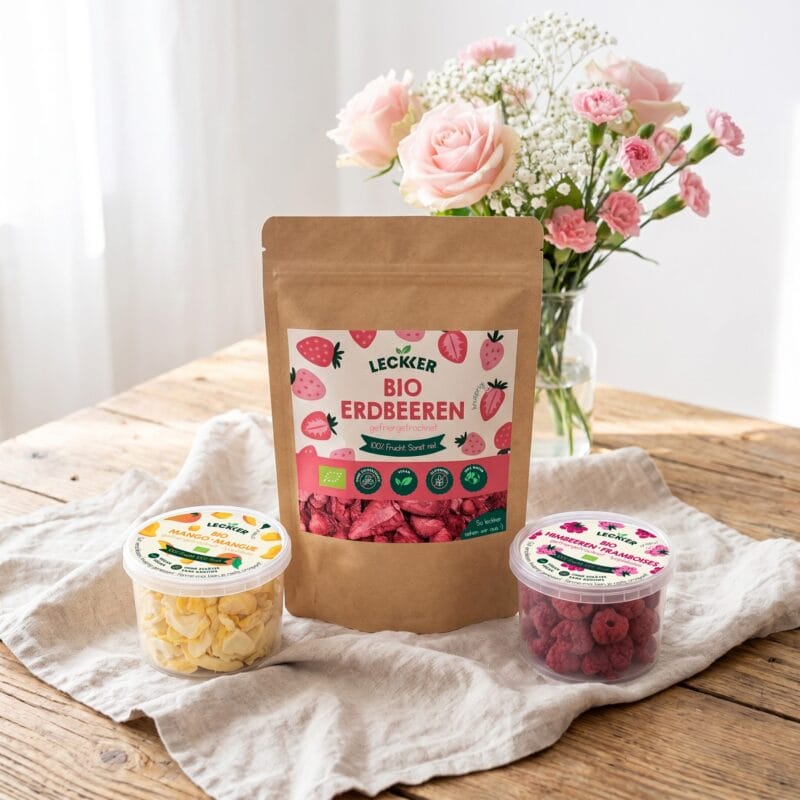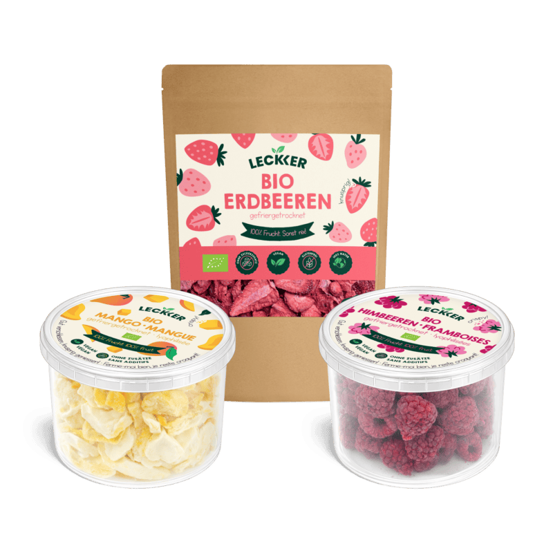 Die gefriergetrockneten Bio-Erdbeeren bringen eine angenehme Süsse und einen intensiven Erdbeer-Geschmack mit, während die gefriergetrockneten Bio-Himbeeren etwas säuerlicher und frischer ausfallen. Die gefriergetrocknete Bio-Mango überzeugt mit einer natürlichen, fruchtigen Süsse, vollem Aroma und extra Knusprigkeit.
